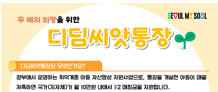 서울시는 아동 자립 지원 정책에 있어 가장 활발한 활동을 펼치고 있는 지역 중 하나입니다. 서울형 디딤씨앗통장은 기본적인 중앙정부의 매칭 구조(월 최대 50,000원 납입 시 1:1 매칭)를 그대로 적용하면서도 서울시 자체 예산과 민간 자원을 활용해 추가 매칭 지원을 제공하고 있습니다. 실제로 일부 자치구에서는 사회복지공동모금회와 연계하여 연 10~20만 원의 추가 적립금도 지급하고 있습니다.